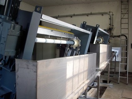 Der Kettenumlaufrechen besteht aus dem selbsttragenden Rahmen mit Rechenfeld, Schürze und Abstreifer, den beiden außenliegenden Antriebsketten mit den Reinigern, den Kettenrädern auf der Antriebswelle mit dem einseitig angeordneten Antrieb und den unteren Umlenkungen mit Kettenführung.