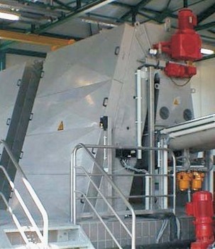 Die Entnahme der Feststoffe erfolgt durch ein umlaufendes Filterband auf dem sich das Rechengut auflegt und ohne weitere Bewegung zwischen Rechengut und Filterband schonend bis in den Abwurf transportiert wird.